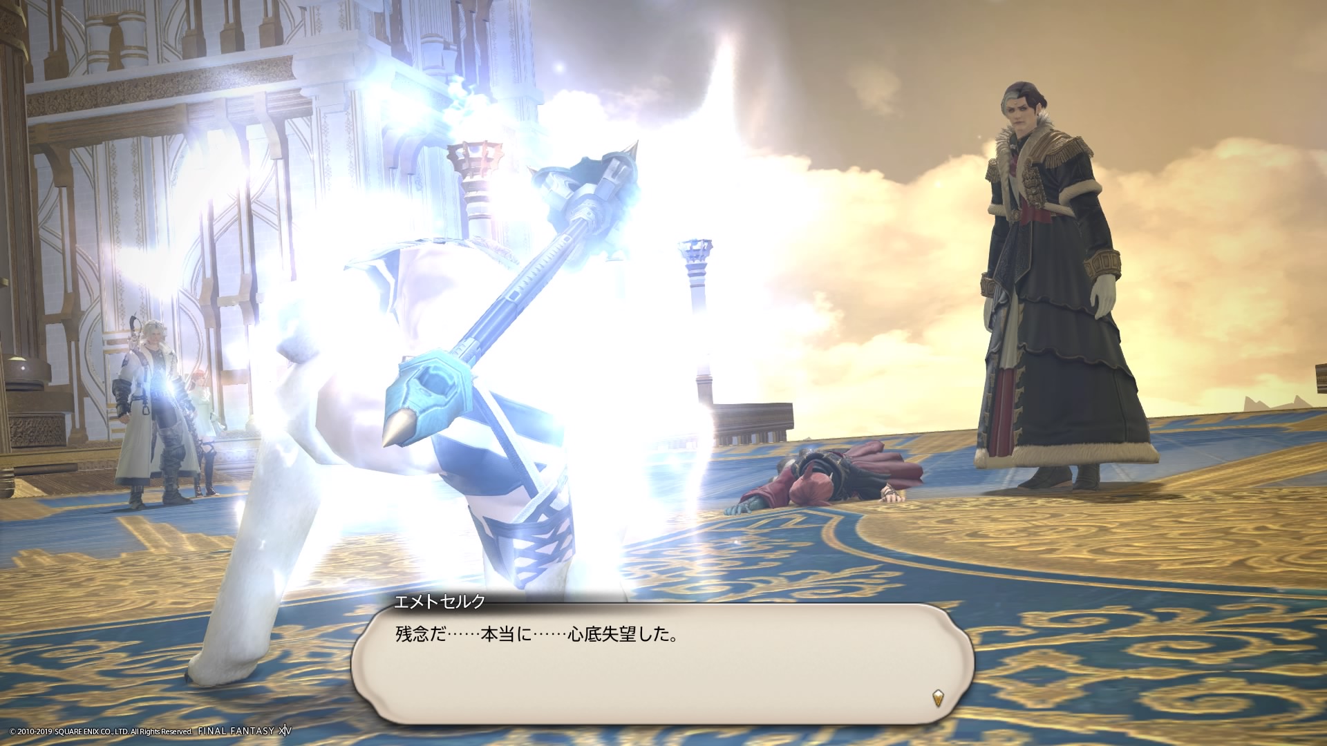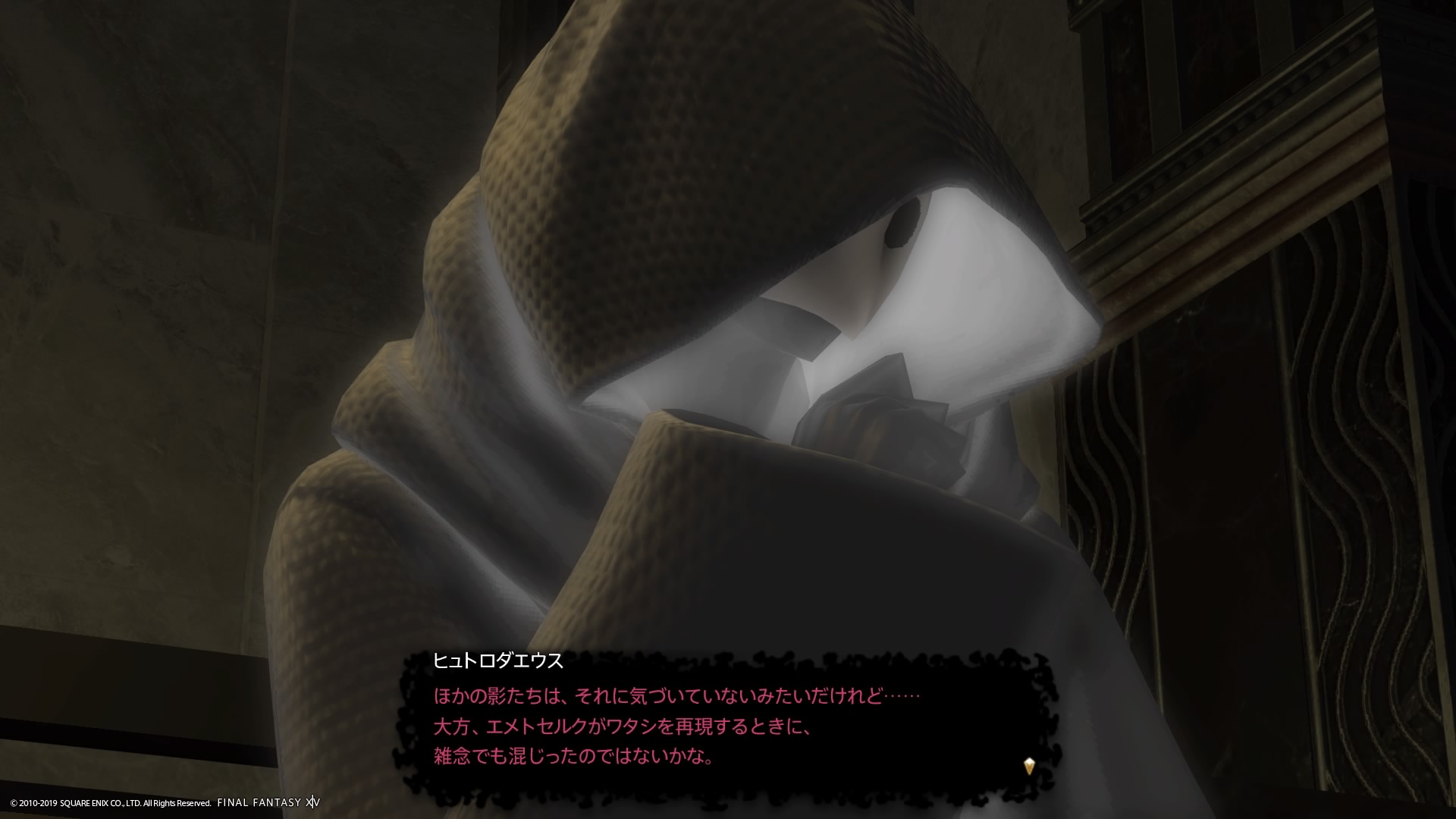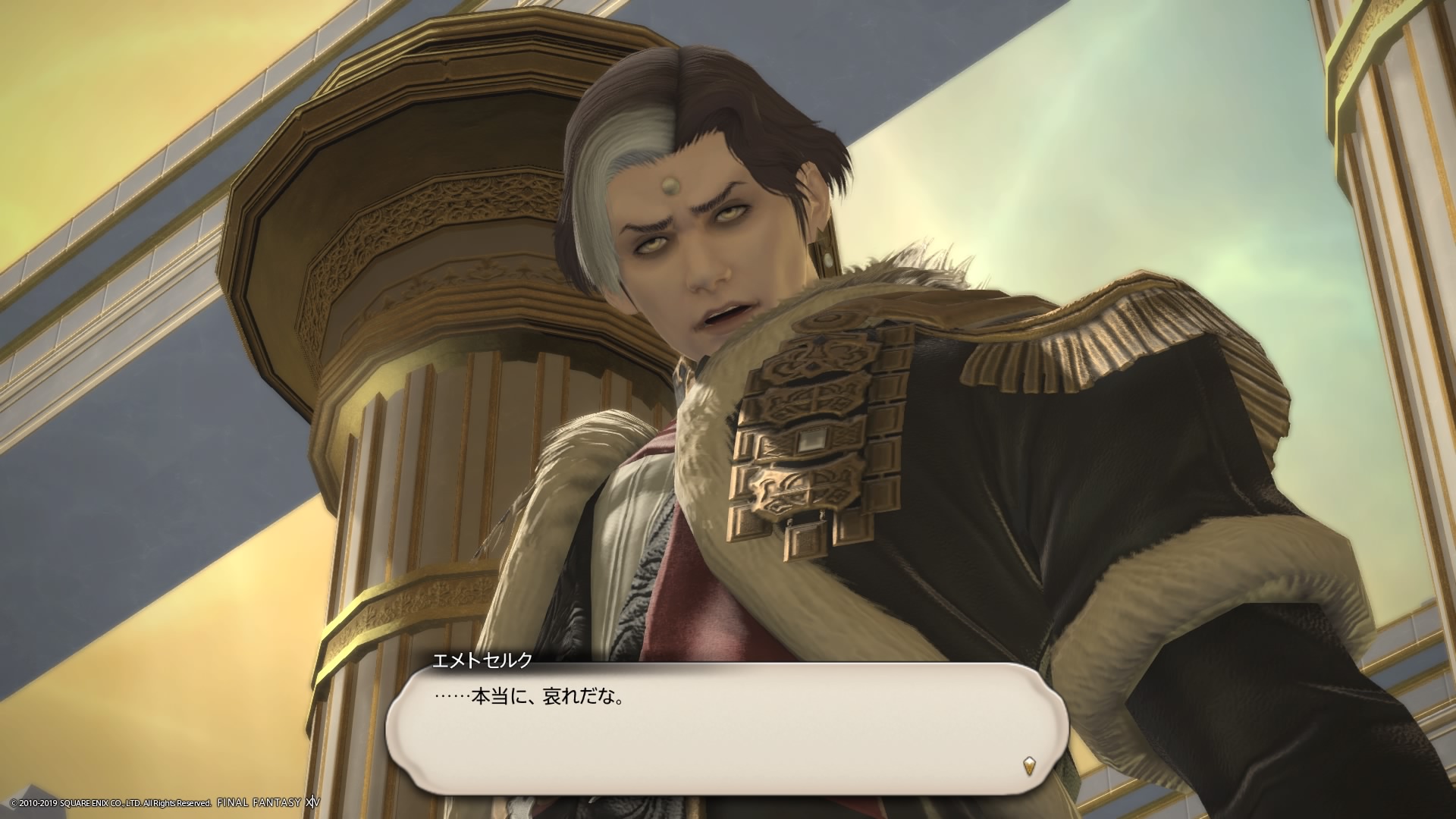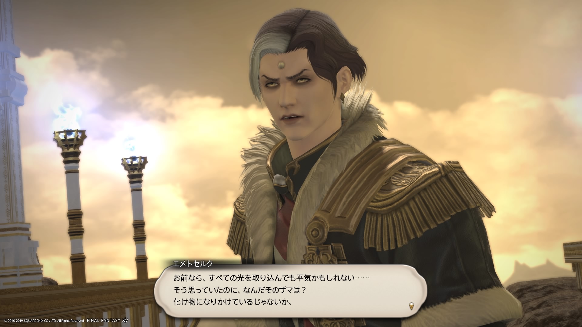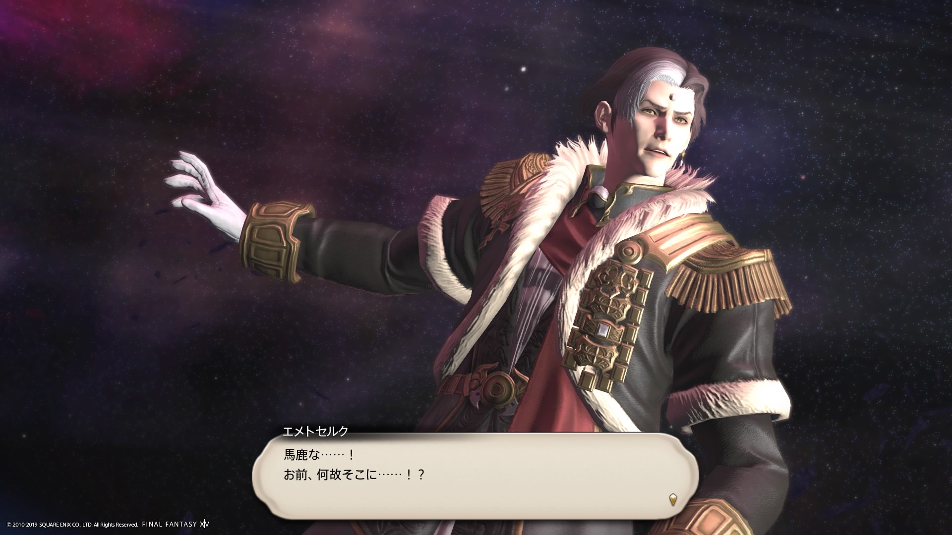 あまりの演技の下手さに思わず後ろからシバきに来た演劇大好きエメトセルクおじちゃん。
