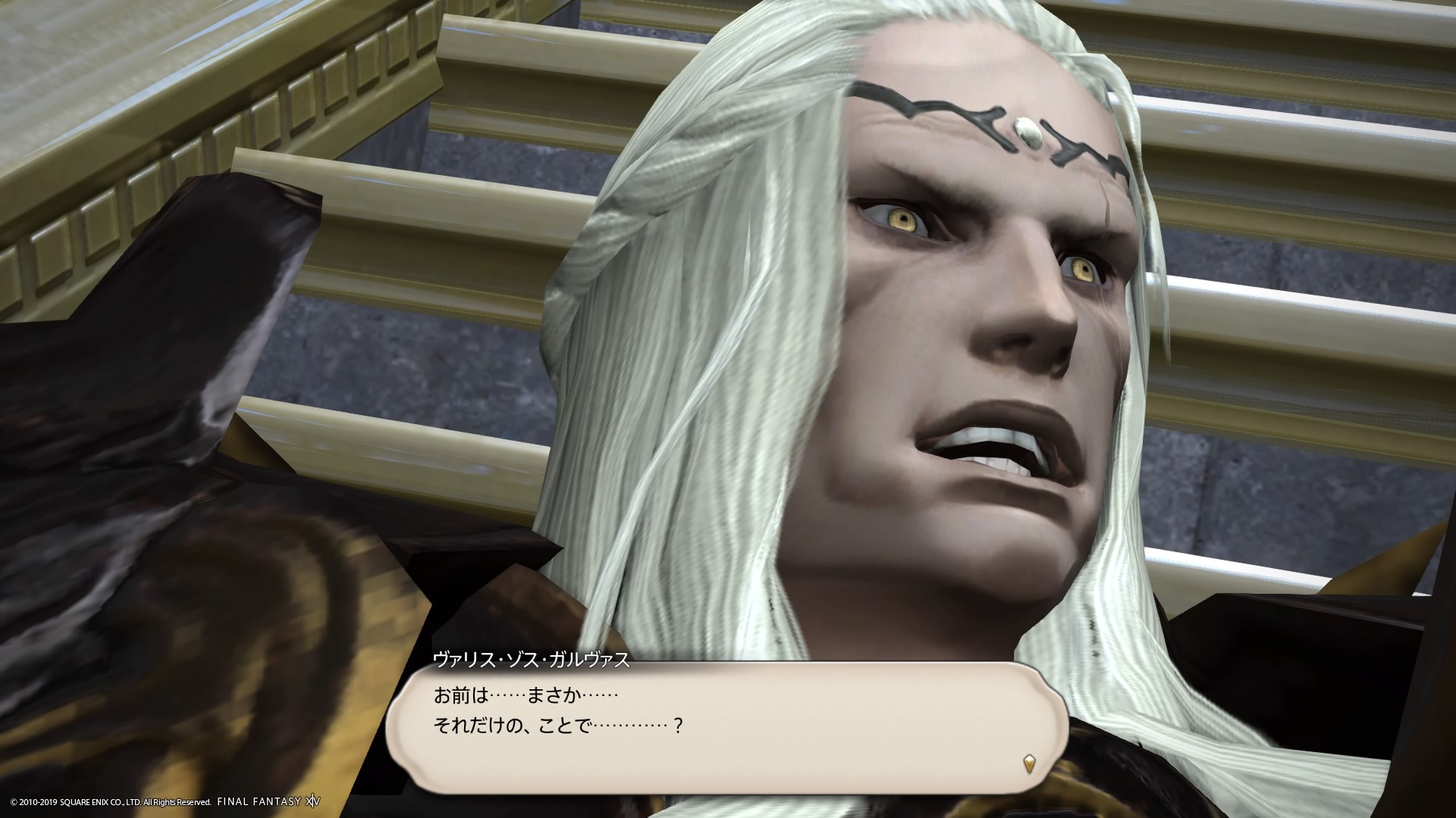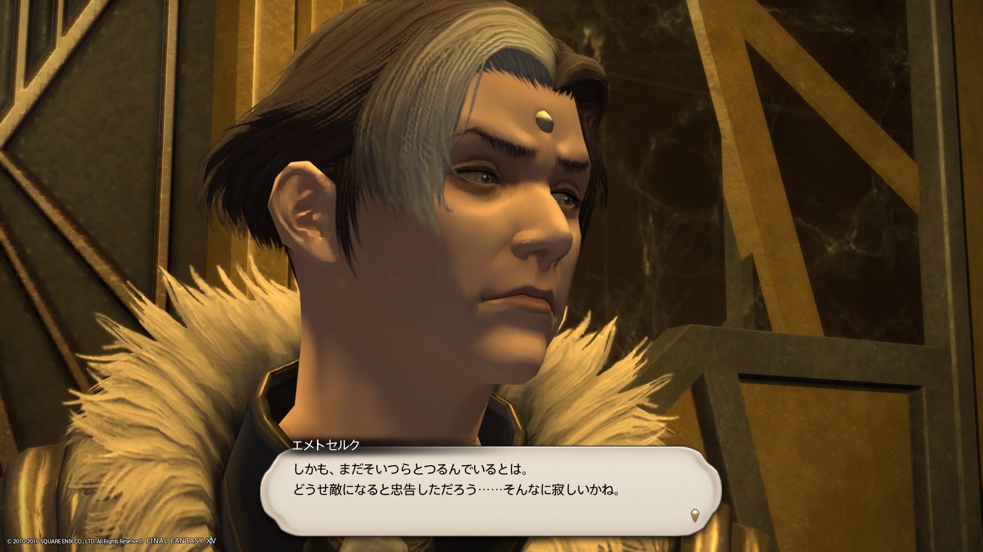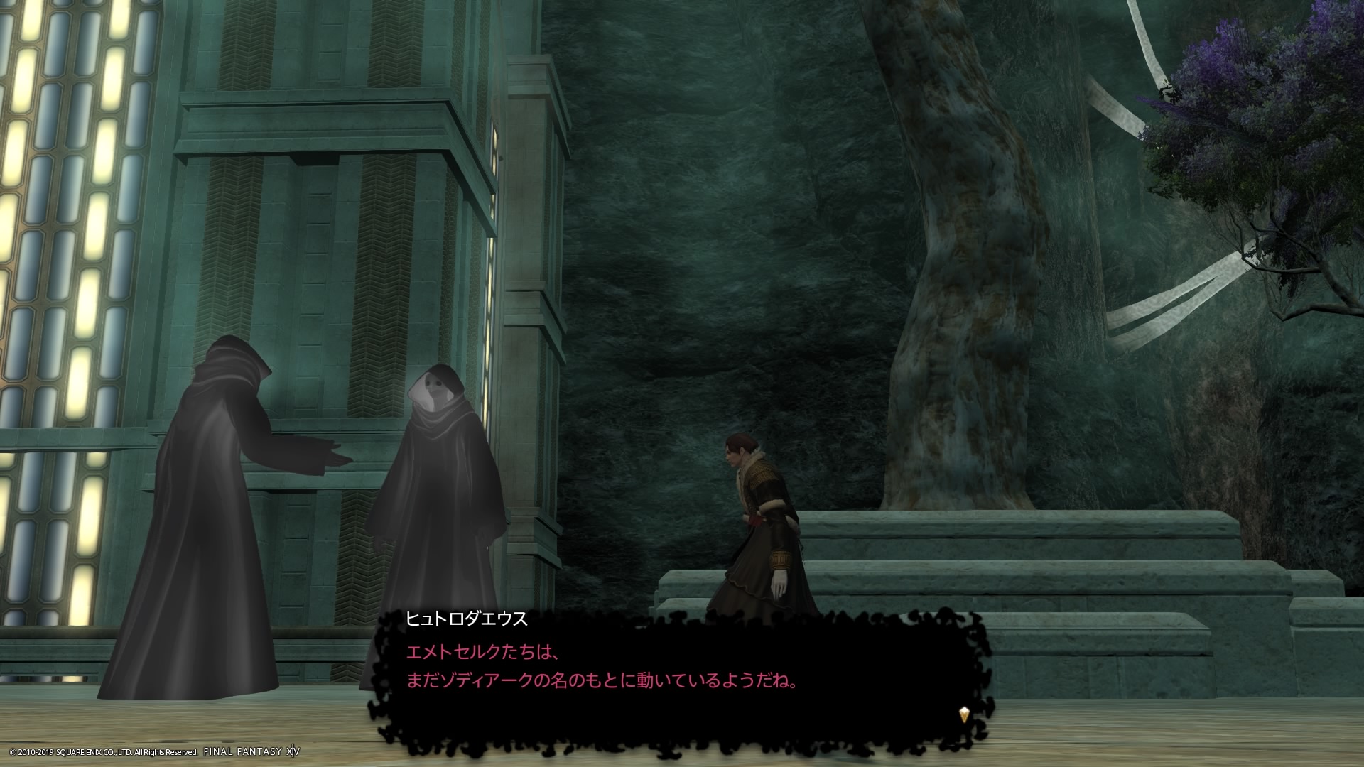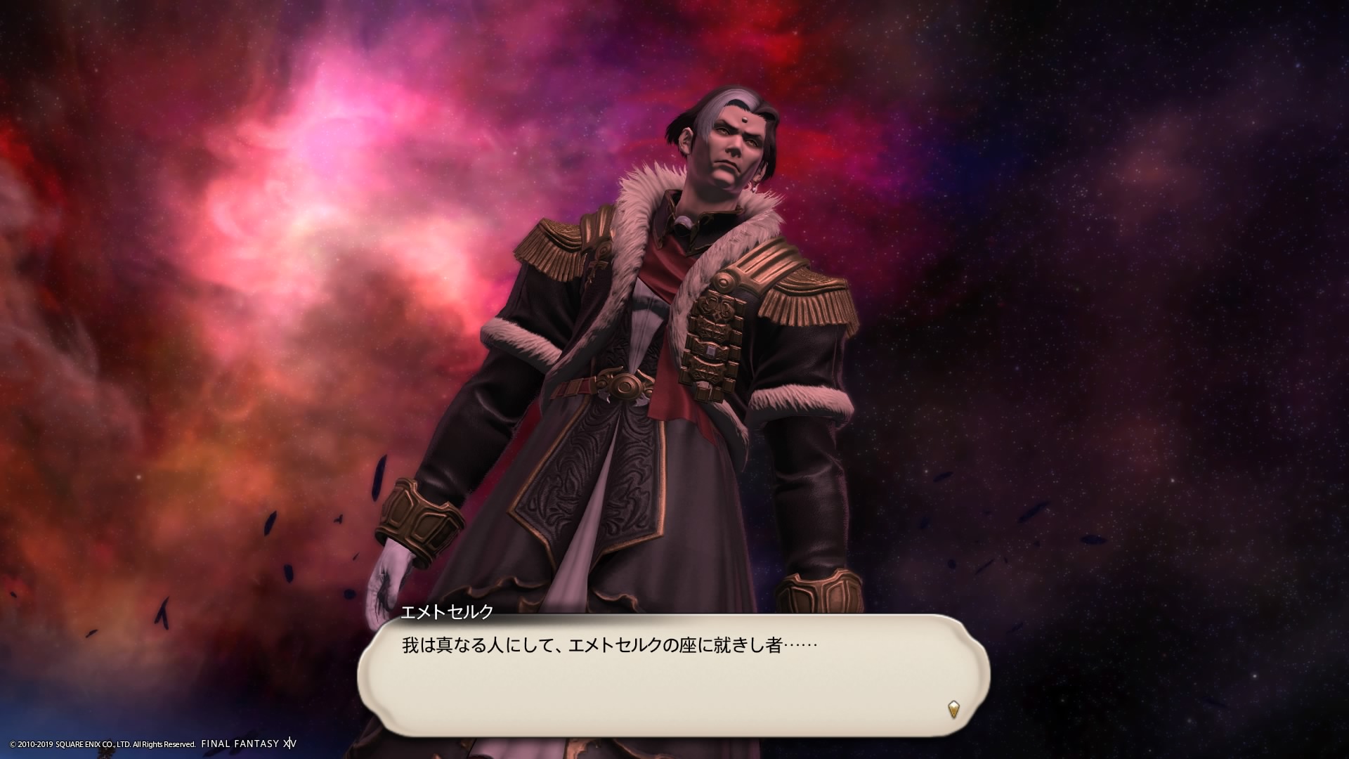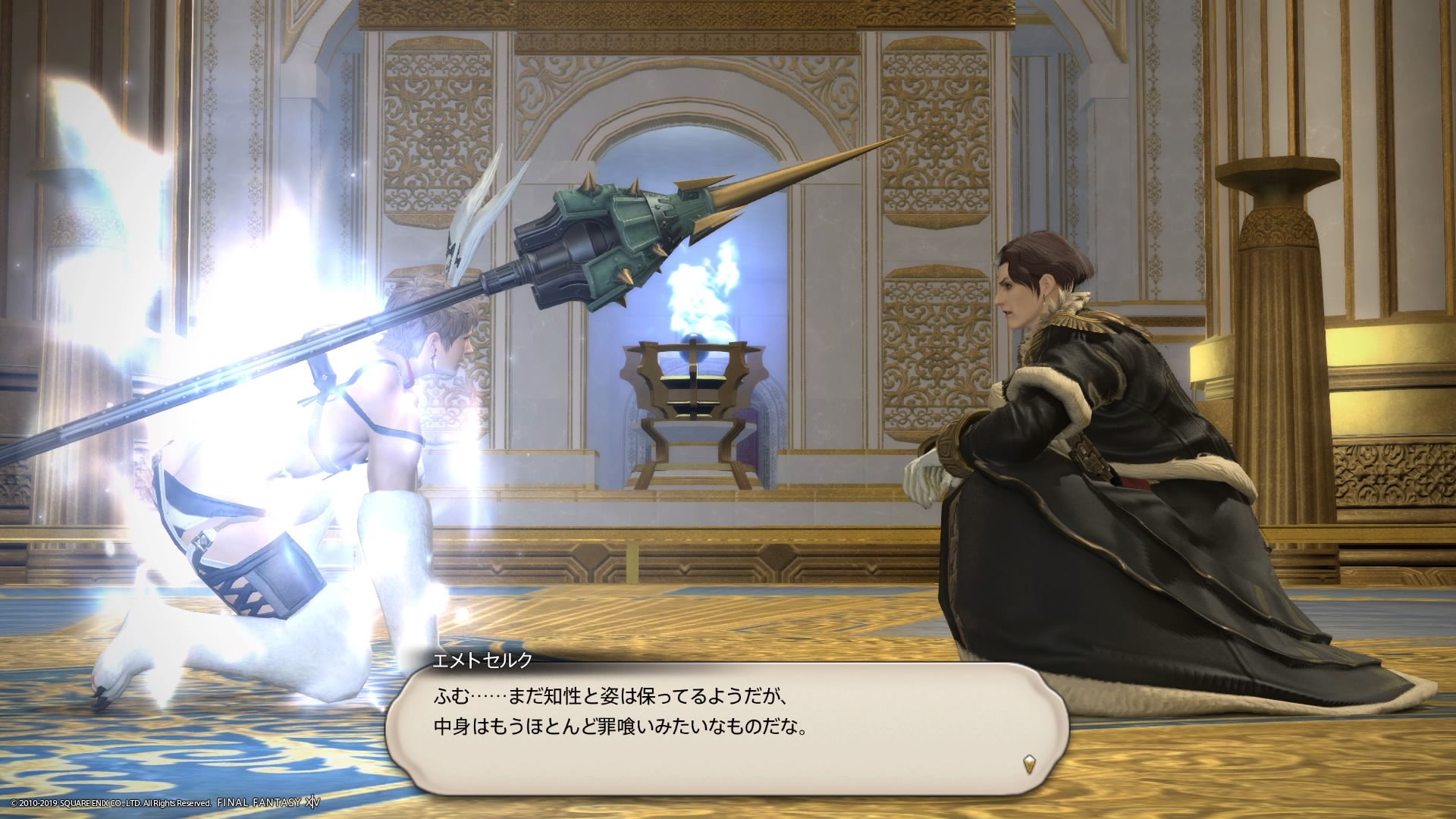 あまりの演技の下手さに思わず後ろからシバきに来た演劇大好きエメトセルクおじちゃん。