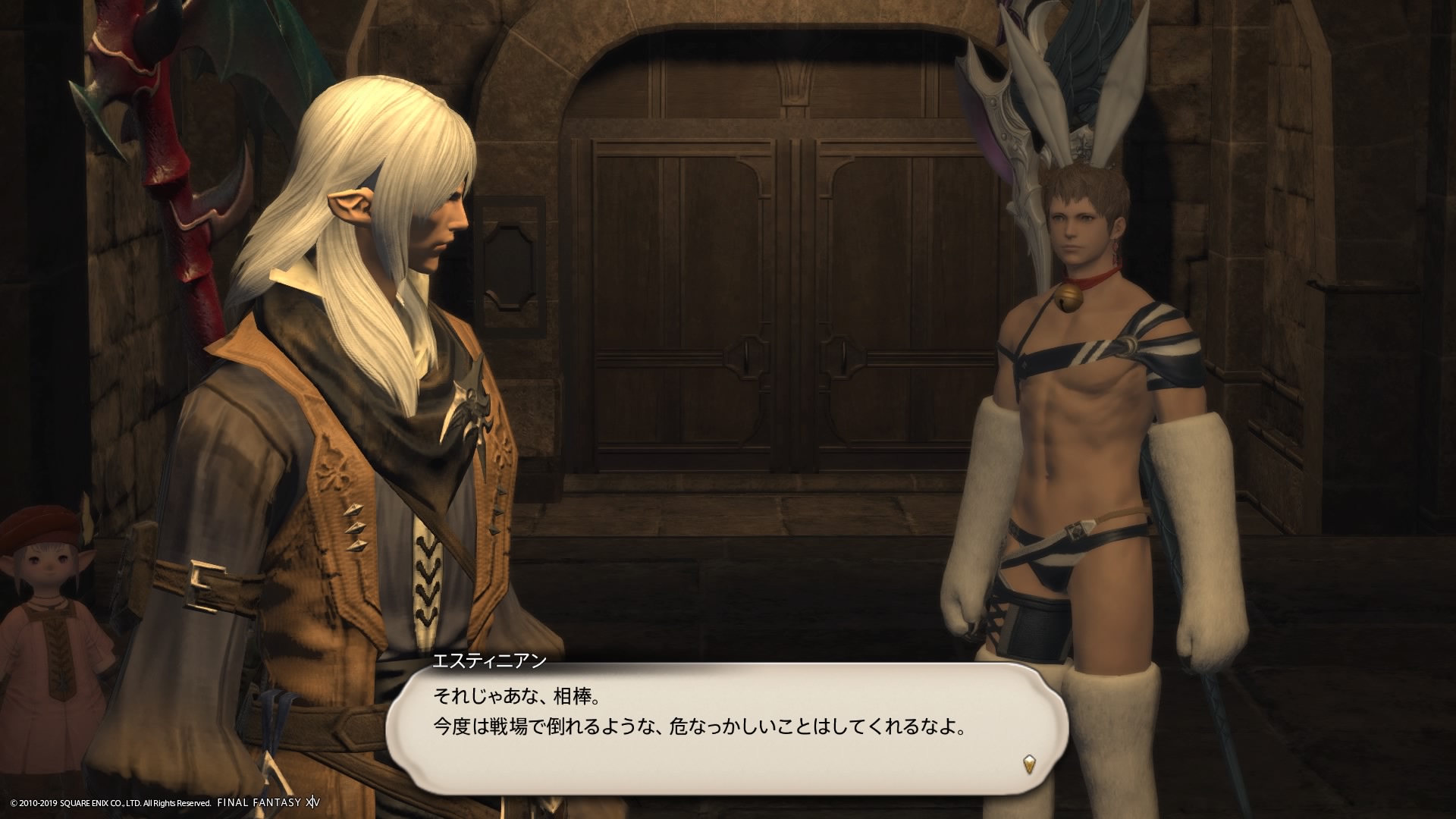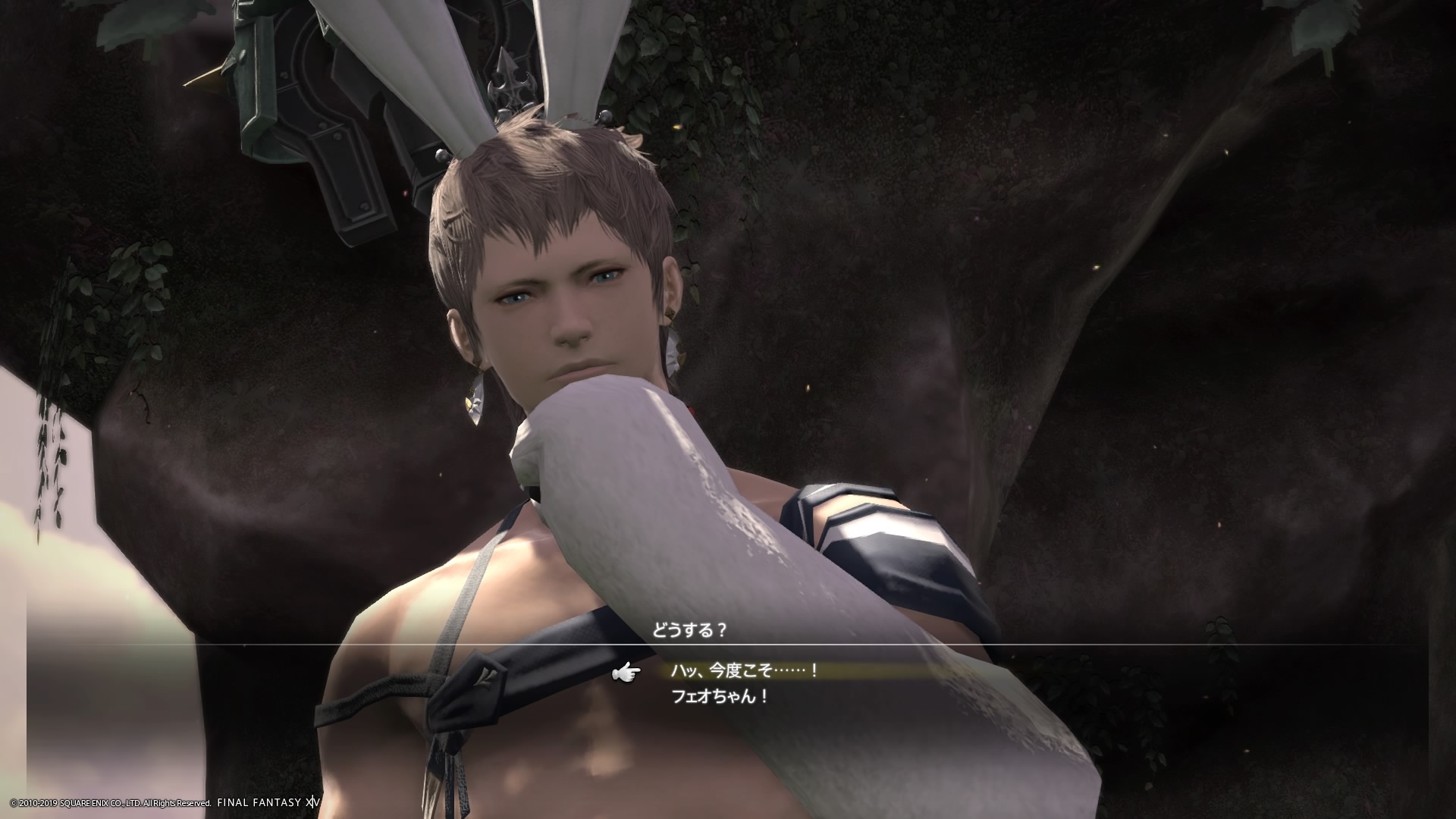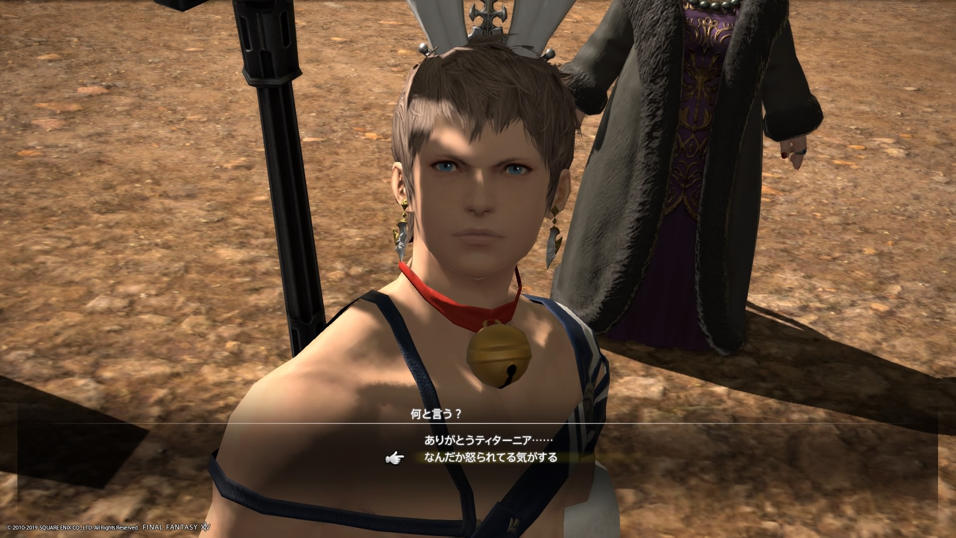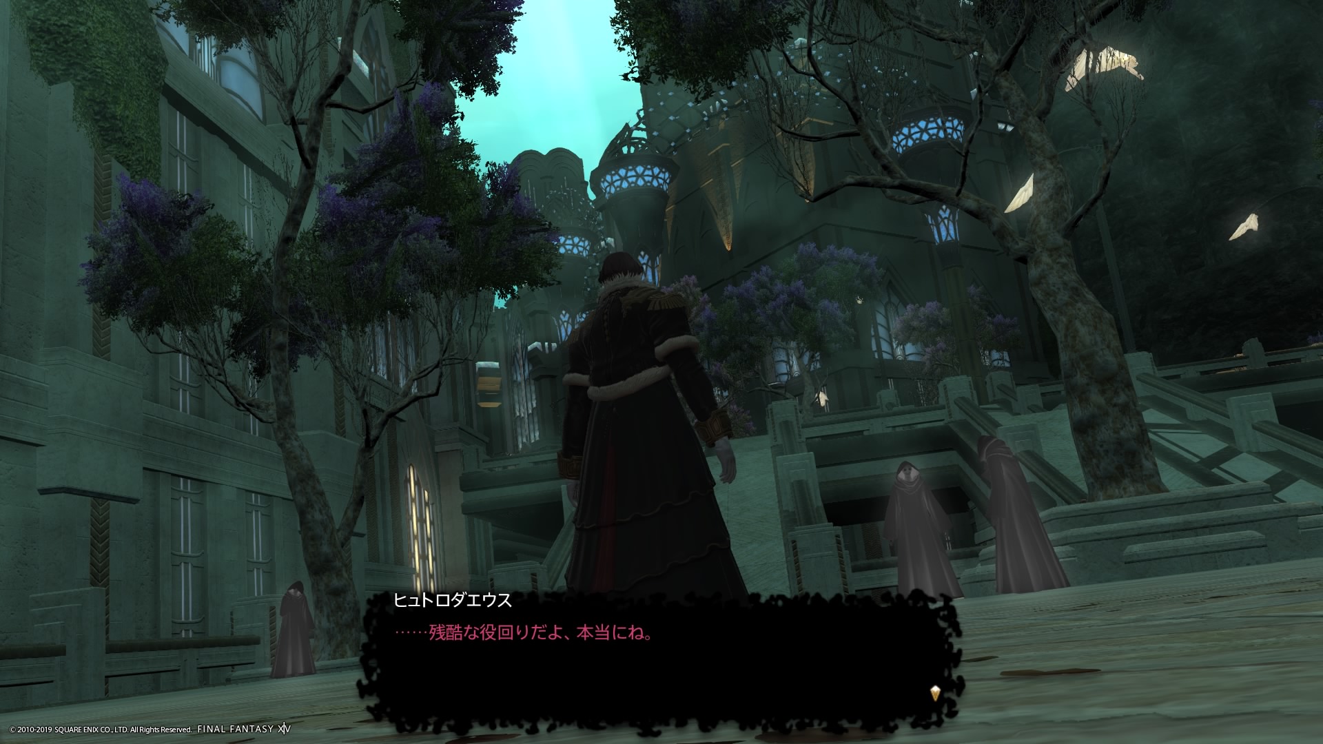 あまりの演技の下手さに思わず後ろからシバきに来た演劇大好きエメトセルクおじちゃん。